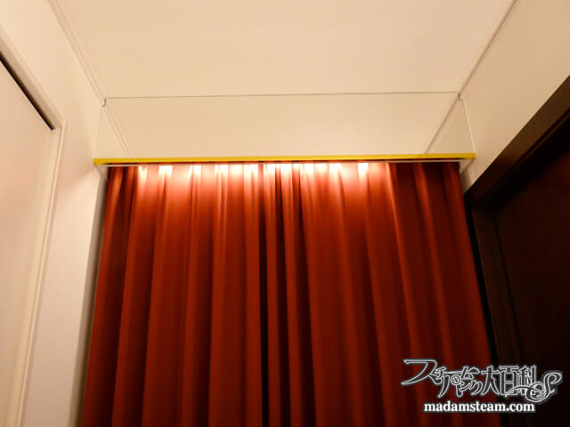 白い壁とのコントラストを強調するために真紅のカーテンに交換し、カーテンボックスも作りました。このカーテンボックスには鏡をはってあります。さて、この鏡の効果とは?