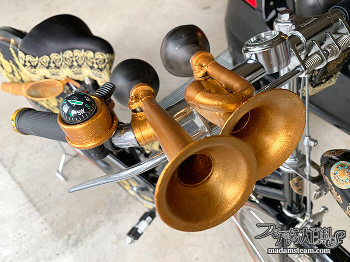 これは私の愛車・ネオヴィクトリアン自転車の黒糖号(こくとうごう)です。最初に購入したのが2010年なのでもう10年も乗っているんですね。自転車は屋外で使用するものなので、定期的なメンテナンスが欠かせません。今回はホーンなどを再塗装しました。
